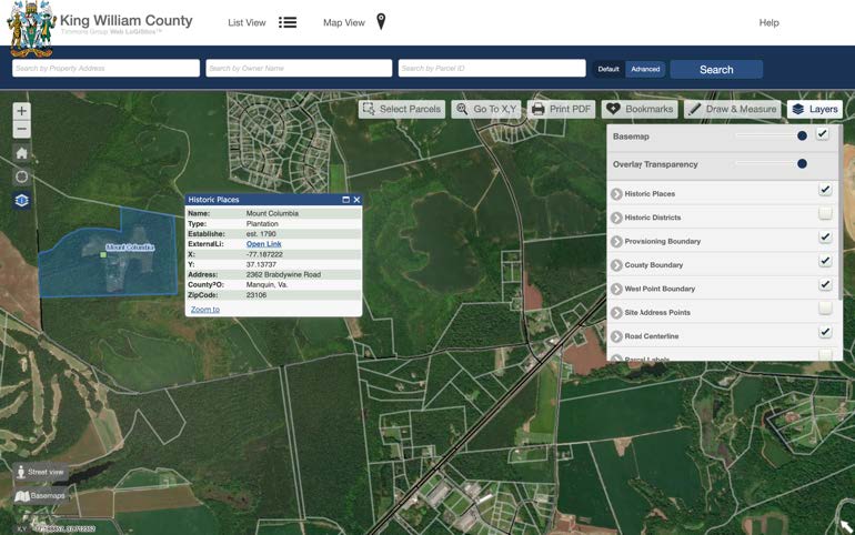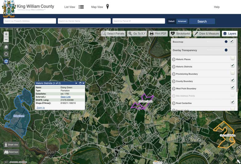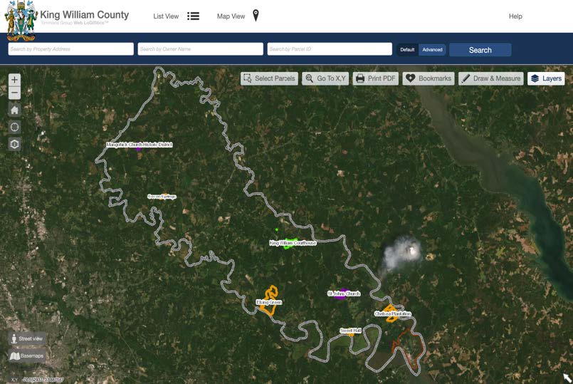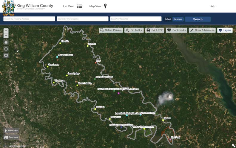 The King William County Historical Society has teamed up with County Administration to create multiple Map “layers” for identifying historic resources in the county. These sites can be a specific GPS coordinate for a building or a grouping of Property Tax Parcels like Historic Districts and Easements.